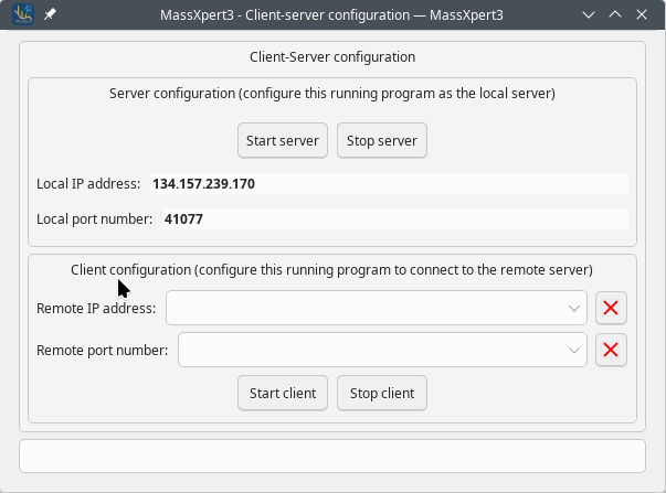 To start the server, click the Start server button and the IP address and port number will be displayed. To start the client, insert the IP address and port number in the Client configuration group box and click Start client .