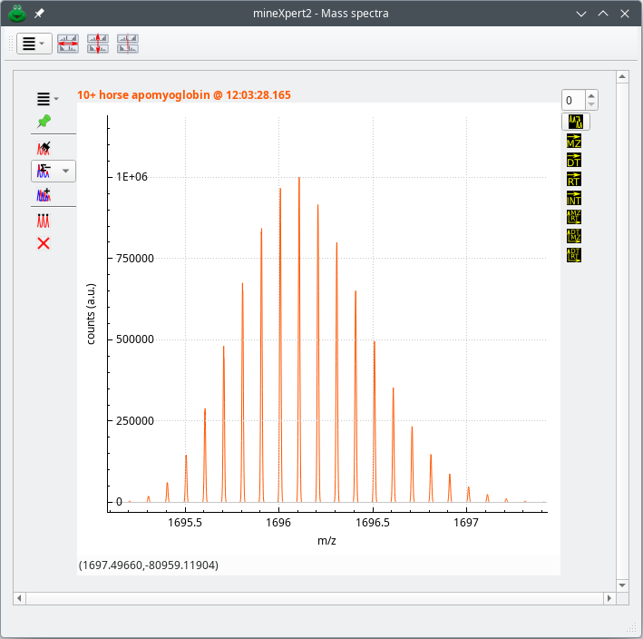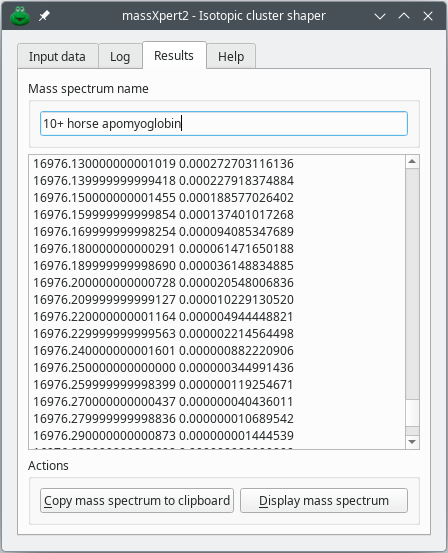 Note that the m/z values calculated by IsoSpec are “corrected” by MassXpert for the charge level that was specified in the left panel of the dialog window prior to their display in the results tab ( ??? ).