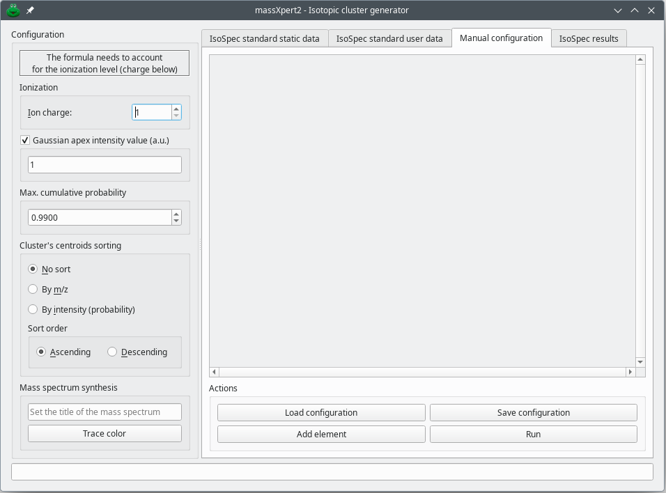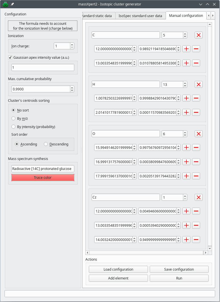 The manual isotopic configuration of the chemical elements required to perform an isotopic cluster calculation for a given formula is tedious. The user may want to save a given configuration to a file (click Save configuration) so that it is easier to recreate automatically all the widgets upon loading of that saved configuration (click Load configuration).