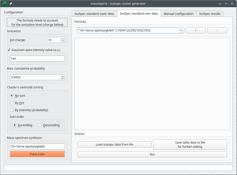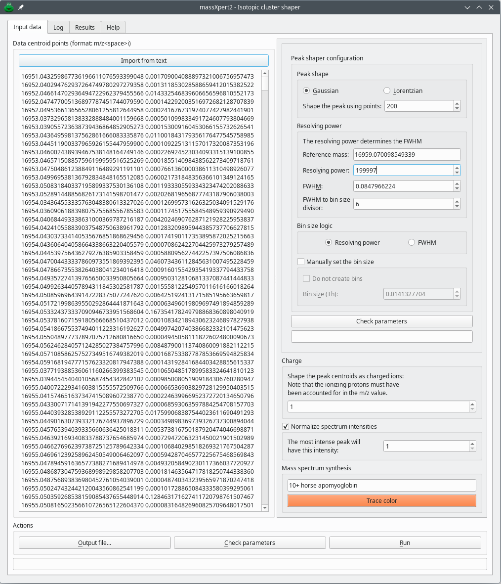 The mass centroid peaks are listed in the Data centroid points (m/z,i) text edit widget. These values may come from different origins. They can be set automatically from the isotopic cluster calculation dialog window (see Section 8.1.1.4, “ The IsoSpec results are centroids ” ); they can come from the user editing them in place; finally they can come from the user pasting text from the clipboard.