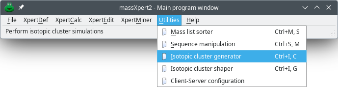 Generating iosotopic clusters using the IsoSpec software package is not easily carried over, in particular because this remarkable library is designed to be highly performant. The authors rightfully put their energy into optimizations for accuracy and speed instead of investing time to design a graphical user interface. MassXpert provides that graphical user interface ( Figure 8.3, “ Isotopic cluster calculation dialog window ” ) , that shows up upon selection of the program's main window's → menu.