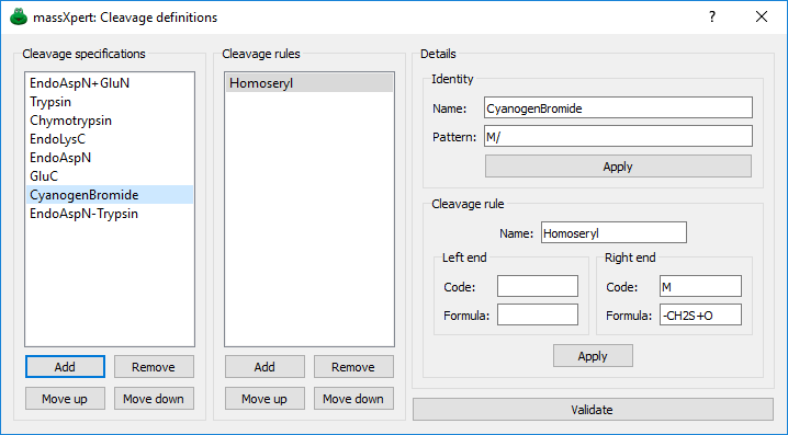 left code and left formula are two line edit widgets for the special cases of cleaving agents that not only cut a polymer sequence (usually it is a hydrolysis) but that also modify the substrate in such a way that must be taken into account by MassXpert so that it computes correct molecular masses for the resulting oligomers. These rules are optional. However, if left code is filled with something, then it is compulsory that left formula be filled with something valid also, and conversely. The cyanogen bromide/protein reaction does not involve any chemical modification (apart from the cleavage) of the monomer left of the generated peptide, so these edit wigets are left blank.