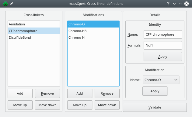 The example described in figure Figure 3.7, “ Cross-linker definition ” , corresponds to the cross-linking reaction involved in the formation of the chromophore of the cyan fluorescent protein. That reaction involves the three following monomers: 65threonyl 66tyrosinyl 67glycyl. Each monomer undergoes a distinct chemical modification: “-o”, “-h3” and “-h”, respectively. Three modifications were thus defined: chromo-0, chromo-h3 and chromo-h, in that specific order, as these modifications are going to be sequentially applied to their corresponding monomer in the cross-linking reaction.