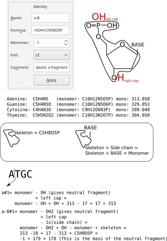 The advantage of working this way is that we need not specify a fragmentation rule for each different monomer in the sequence (see below, for how this might be done). Indeed, by specifying monomer to be -1, we indicate—without knowing the monomer identity—to the mass calculation engine that once the fragmentation has occurred in the polymer chain, the mass of the monomer that got fragmented should be subtracted from the fragment mass. That subtraction removes, however too much material, as we do not want to loose the skeleton, we only want to loose the base (adenine, in our example). This is why we ask in the fragmentation specification formula that the skeleton be added (the +c5h8o5p component of the formula). Because the skeleton does not change along the polymer chain, even if the base itself changes, this computation method is generalizable, and because of this the polymer chemistry definition works.
