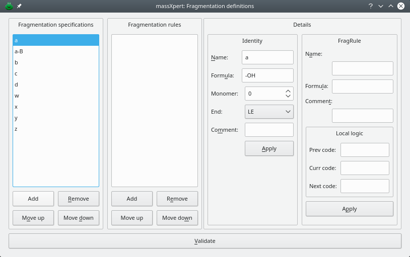 Note that in saccharide chemistry, the fragmentation patterns are extremely complex, and often totally depend on the nature of the monomers local to the fragmentation site. For example, the fragmentation behaviour at position “e” in a sequence “dear” might be different than in a sequence “dera”. MassXpert had to be able to model these complex situations, and this is done using fragmentation rules where the local logic involves defining the prev code and/or the next code for a given curr code at which the fragmentation occurs. For example, one specific fragmentation pattern for fragmentation at “e” in sequence “dear” might be defined this way: