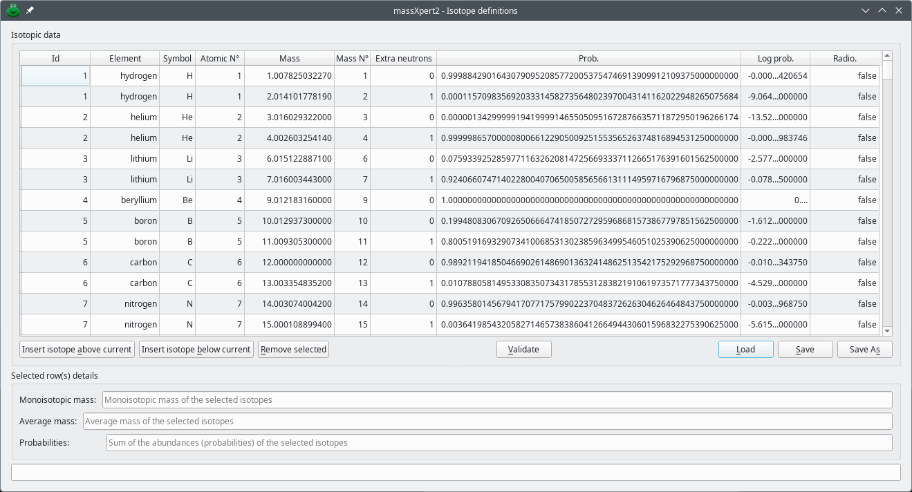 The table view is editable. Each cell, when double-clicked, switches to an edit mode in which the user might enter a value. A series of buttons below the table view trigger various actions. To add a new isotope, either above or below the currently selected one, click of the two Insert isotope... buttons. To remove isotopes, select them and click the Remove selected button. The three buttons on the right hand side of the window, allow loading, saving and saving with a new file name the isotopes currently displayed in the table view.