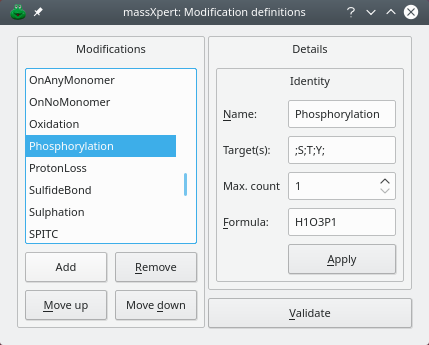 Click modifications to open the dialog window shown in figure Figure 3.6, “ Modification definition ” . In the example shown, the phosphorylation modification is being defined. a modification is defined by: