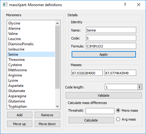 The mass difference between any two monomers in the definition is computed and displayed only if it is less or equal to a threshold (see figure Figure 3.4, “ Monomer definition ”