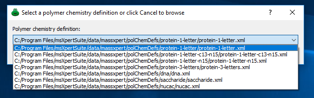 To open a polymer chemistry definition, the user may either select one that is already registered with the system, and that appears listed in the drop-down list widget shown in figure Figure 3.1, “ select one polymer chemistry definition file. ” or click the button so as to open one definition file by browsing the filesystem. In the polymer chemistry definition window that shows up, the user accomplishes two different tasks: