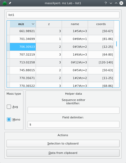 If there is no charge value, then the other name and coordinates fields cannot be filled (or an error will result). The presence of the name and coordinates fields is optional. Note, however that the coordinates field is fundamental to be able to highlight the corresponding region in the XpertEdit sequence editor upon double-clicking of any given item in the m/z list. For this to be possible, the data must have been originated by drag and drop from a MassXpert simulation results window or the m/z list window must have been connected to a polymer sequence editor window (see below).