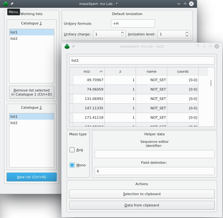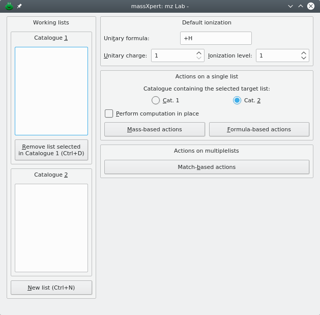 The left part (Working lists) contains two list widgets which will hold the names of the different working m/z lists. We call these lists “catalogues” in the following text;