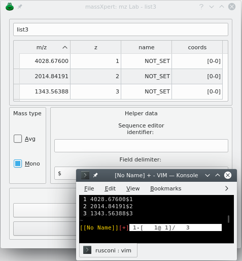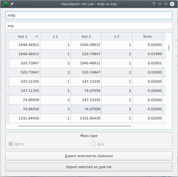 When dropping data—either from MassXpert-driven simulations (cleavage, fragmentation or mass search) or from textual data originating from outside MassXpert—it is necessary to inform the input m/z list of what kind of mass it is dealt with. That is, when dropping a line like “1234.56 1”, the question is: —“The m/z 1234.56 value is a monoisotopic m/z or an average m/z?” The type of the masses dropped in an input m/z list is governed by the two radio buttons labelled Mono and Avg. The one of the two radiobuttons that is checked at the moment the drop or the clipboard-paste occurs determines the type of the masses that are dealt with. It will be possible to check the other radio button widget once a first data drop occurred, but then the user will be alerted about doing so, as this has huge implications for the calculations to be performed later.