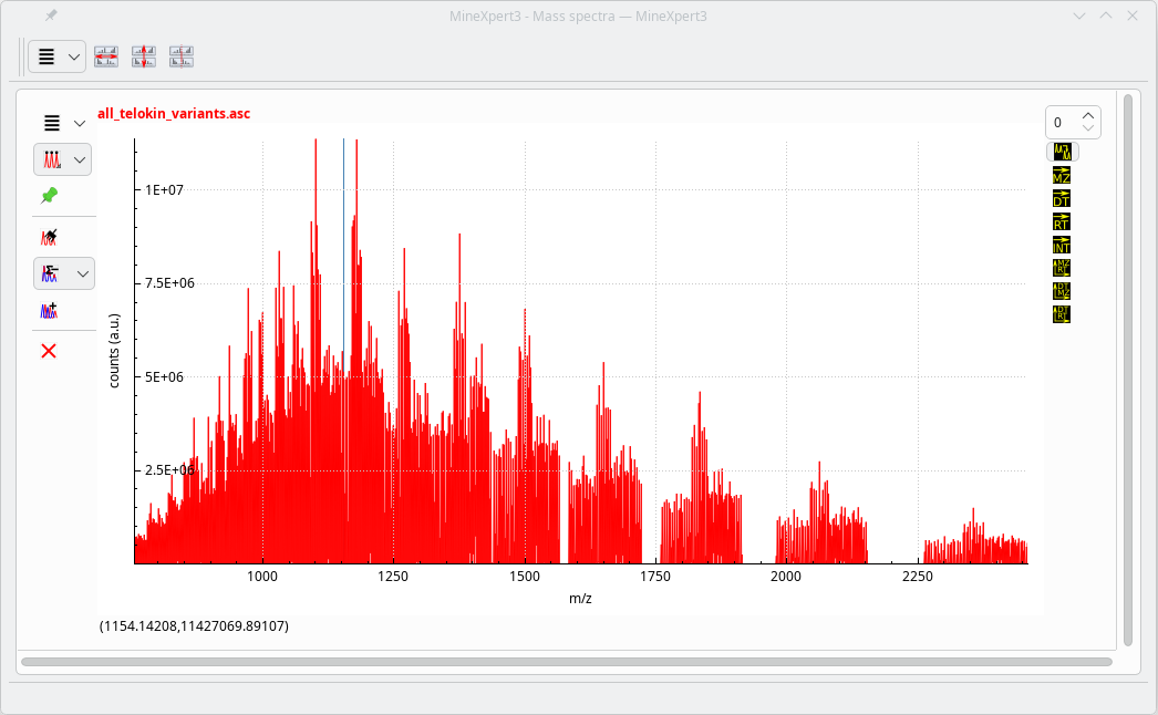}The output of this script is a mass spectrum that is automatically rendered in a MineXpert program's mass spectra window if the program is installed on the computer. See Figure 7.2, “Mass spectrum as generated using the script displayed in MineXpert” .