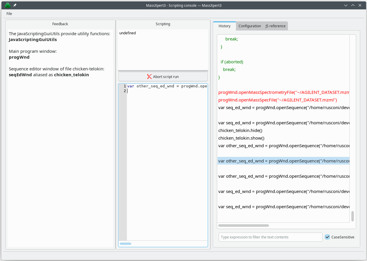 The window is divided into three vertical panes. The left hand side pane collects all the program's feedback to the user, so they are informed of any new variable that is created in the JavaScript environment and made available to them. The middle pane has two regions. The upper region will display all the return values after any JavaScript command has been run. The lower region is the actual script input region. The right hand side region contains mainly the history of the commands issued during the previous and current scripting sessions.