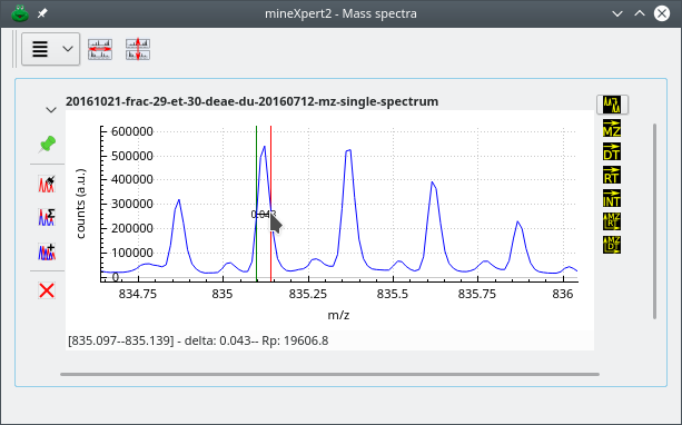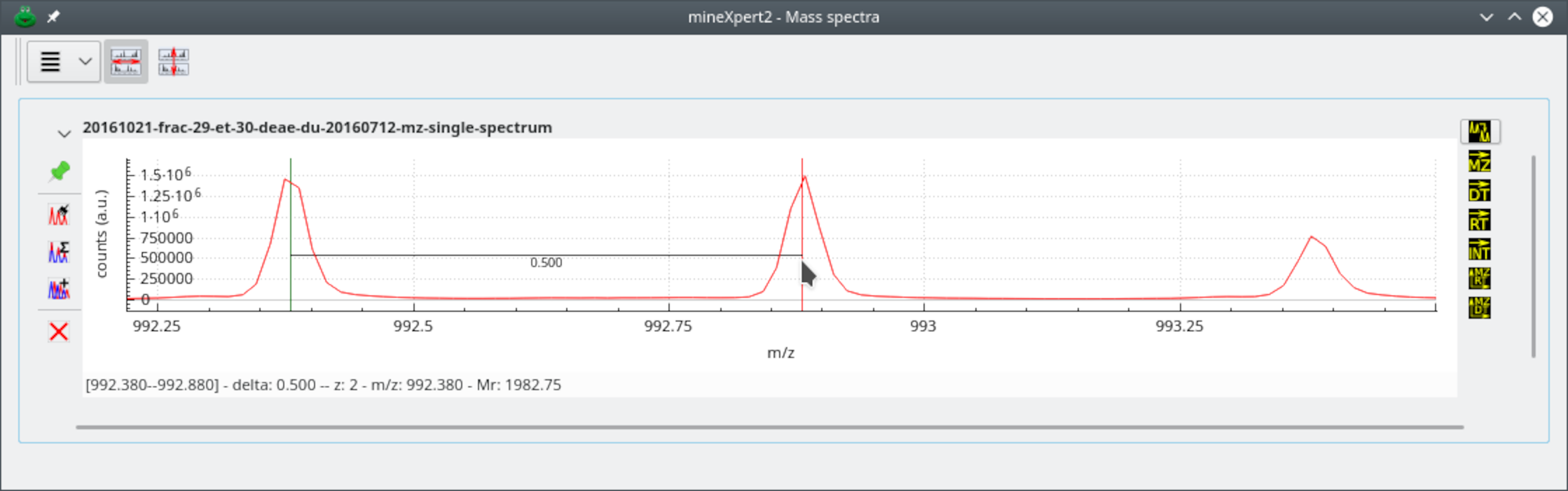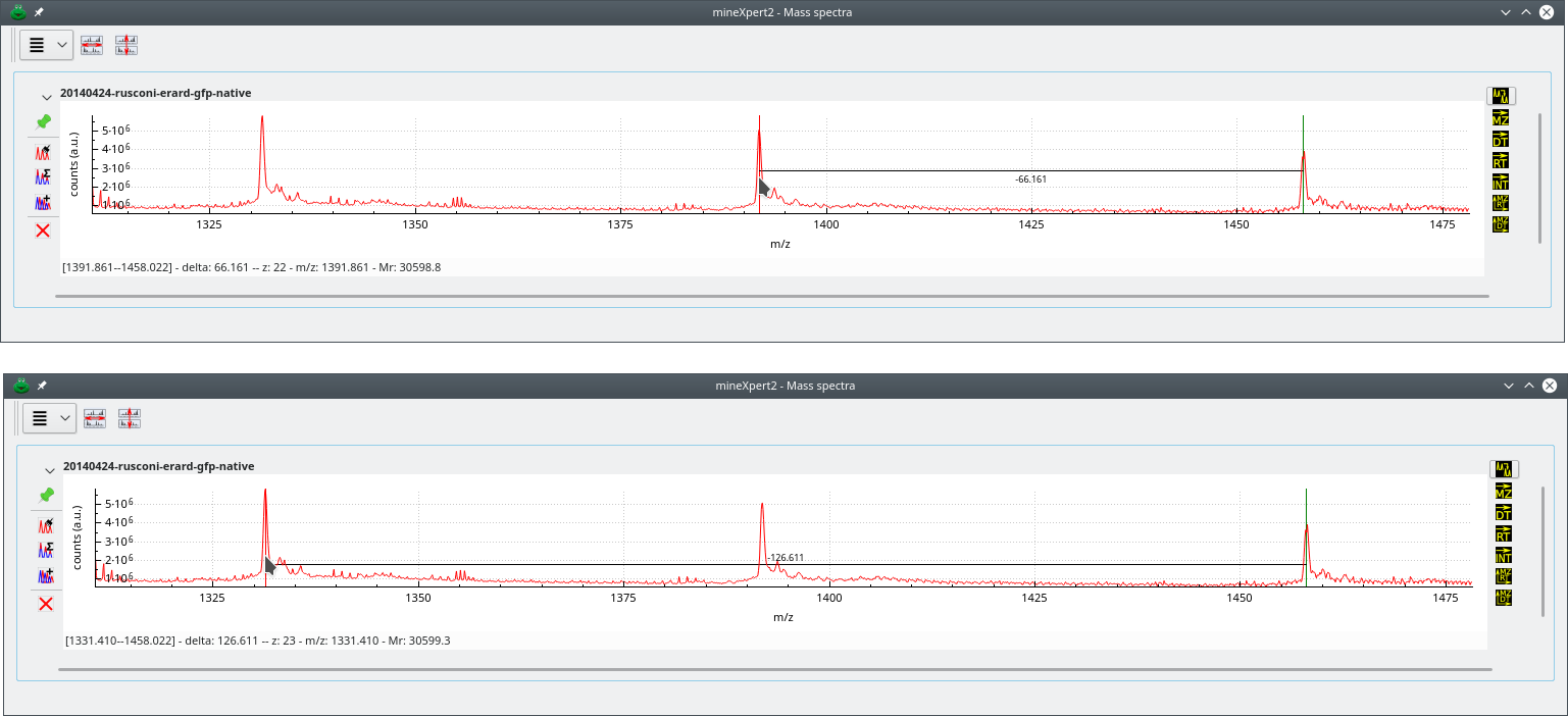 Note that the charge calculation almost never produces an integer value with no fractional part (say, charge z=15.0) because it is almost impossible to drag the mouse cursor the exact m/z range that would lead to such an integral charge value. Almost always, the charge that is calculated looks like 14.995 or 15.001, for example. Why is it impossible to drag the mouse cursor exactly the interval that would produce an integral charge value? Simply because the mouse moves at discrete positions on the screen and these positions might be more or less far apart, depending on the mouse capabilities and on the current zoom factor over the mass spectrum region of interest. It is advised to zoom-in as much as possible over the peaks at hand so as to minimize the difficulties above. It may happen, however, that even zoomed-in peaks are not sufficiently distant to allow a charge calculation. In this case, reduce the stringency over the fractional part that is allowed in the charge (see menu item Set charge minimal fractional part at Figure 4.1, “Mass spectrum plot widget-specific deconvolution menu”). By default, the stringency is set at 0.99, that is, any calculated value that has a fractional part either superior or equal to 0.99 or inferior or equal to 0.01 would lead to a successful round-up/round-down to the nearest integer value. Outside of the [0.01-0.99] interval, no charge calculation is performed and thus no deconvolution is performed. When the stringency is too high, reducing it will allow the deconvolution to be carried-over. My own experience is that setting that value to 0.995 is fine for most situations and provides very reliable results.