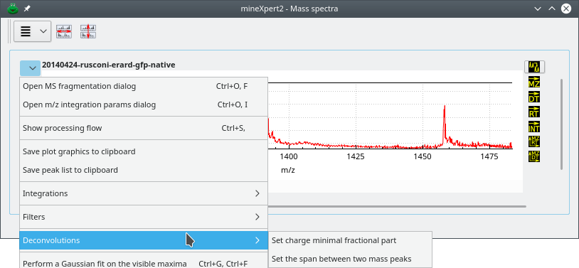 Before delving in the deconvolutions, it is necessary to present two menu options that are found in the plot widgets contained in the Mass spectra window: the menu items under the Deconvolutions menu (Figure 4.1, “Mass spectrum plot widget-specific deconvolution menu”).