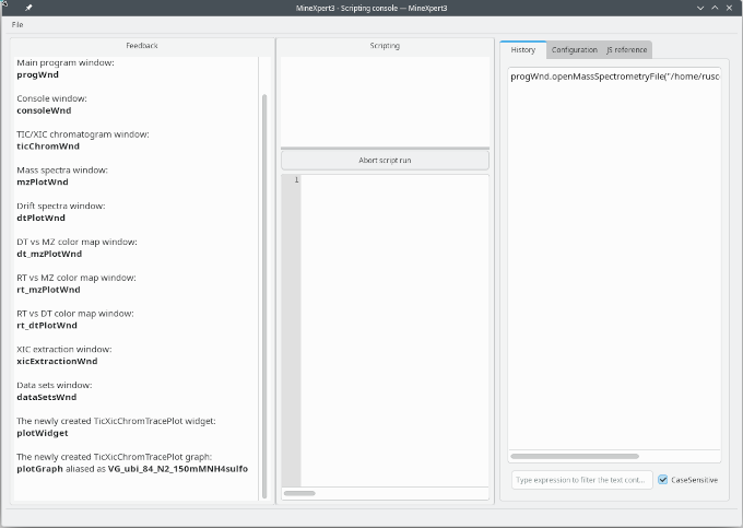 The window is divided into three vertical panes. The left hand side pane collects all the program's feedback to the user, so they are informed of any new variable that is created in the JavaScript environment and made available to them. The middle pane has two regions. The upper region will display all the return values after any JavaScript command has been run. The lower region is the actual script input region. The right hand side region contains mainly the history of the commands issued during the previous and current scripting sessions.