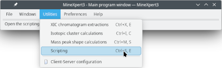 The scripting console window is easily called by pulling down the menu item from the MineXpertprogram's menu, as represented in Figure 8.1, “Starting the scripting console window” .